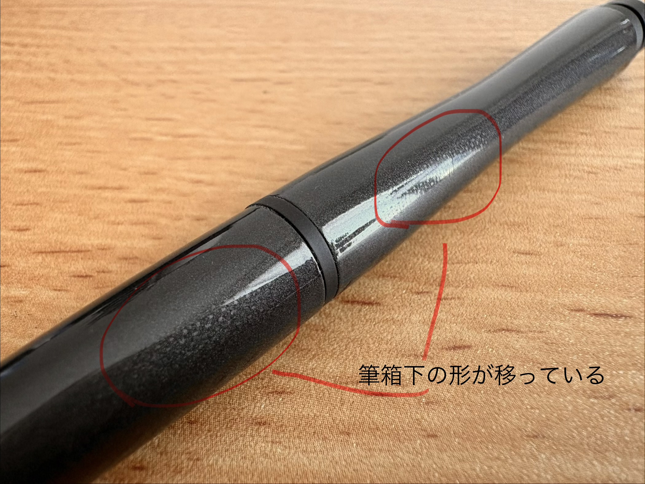これらの要因としては、保管時の圧迫や、筆箱内の湿気・熱などがあると考えられ、加えてAeroの塗装がこの手の環境に弱かったことで、模様が移ってしまったのかも知れません。
