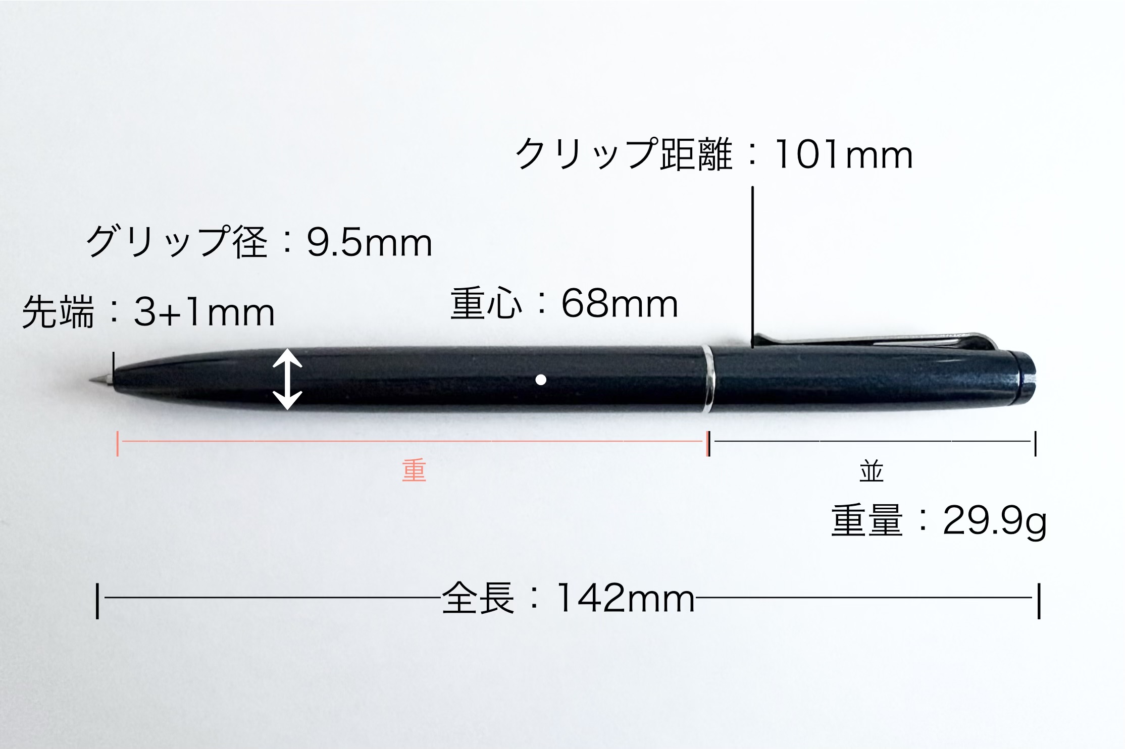 重心位置は真ん中より低めで、全長も長すぎませんが、29.9gもあるので決して軽快に書きやすくはありません。あくまで同じような高級ペン、重量級の中で書きやすさも考慮されているといったところです。