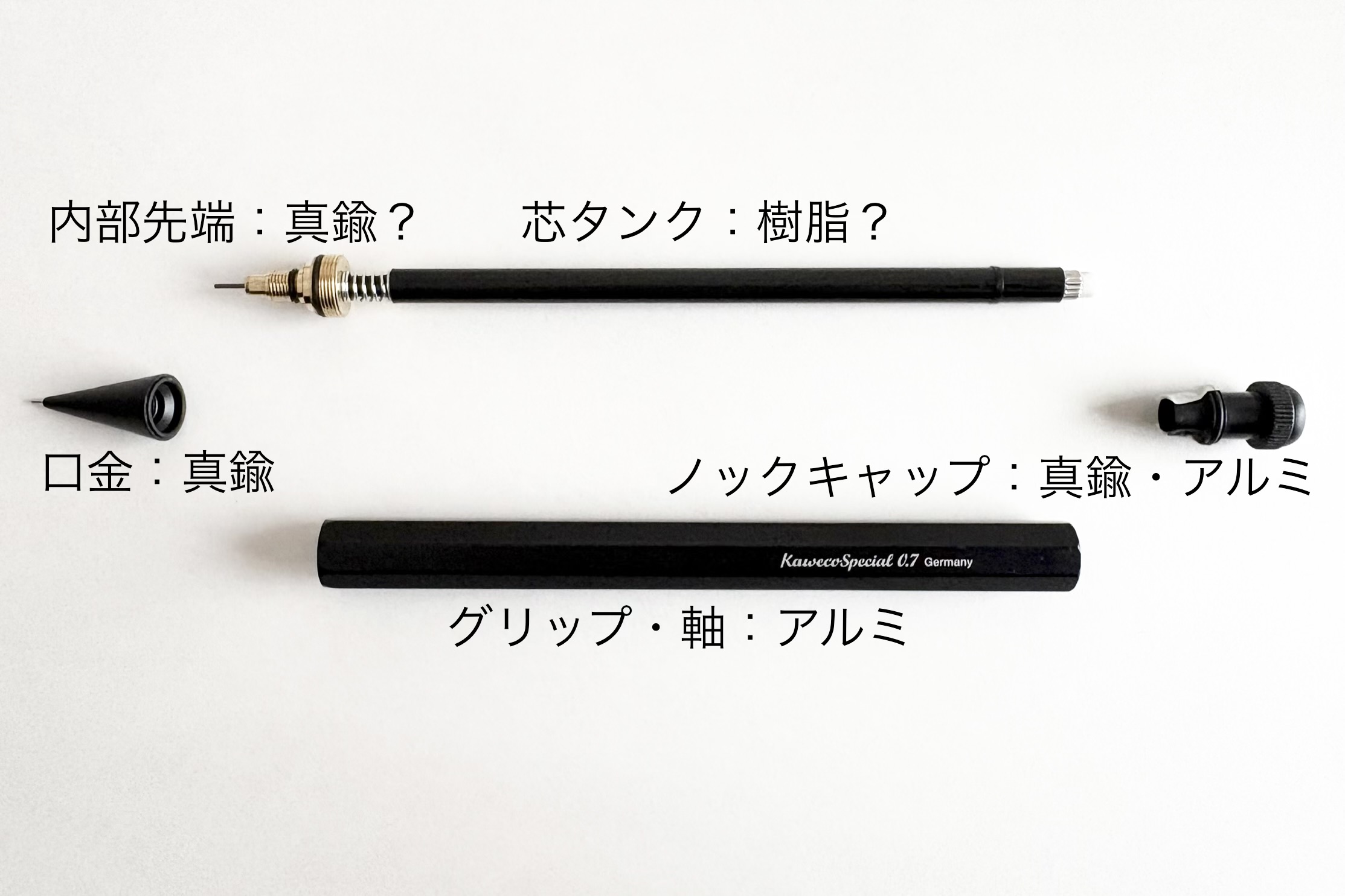 | 素材 | グリップ・軸:アルミ 口金:真鍮 キャップ:真鍮・アルミ・(ABS樹脂) |