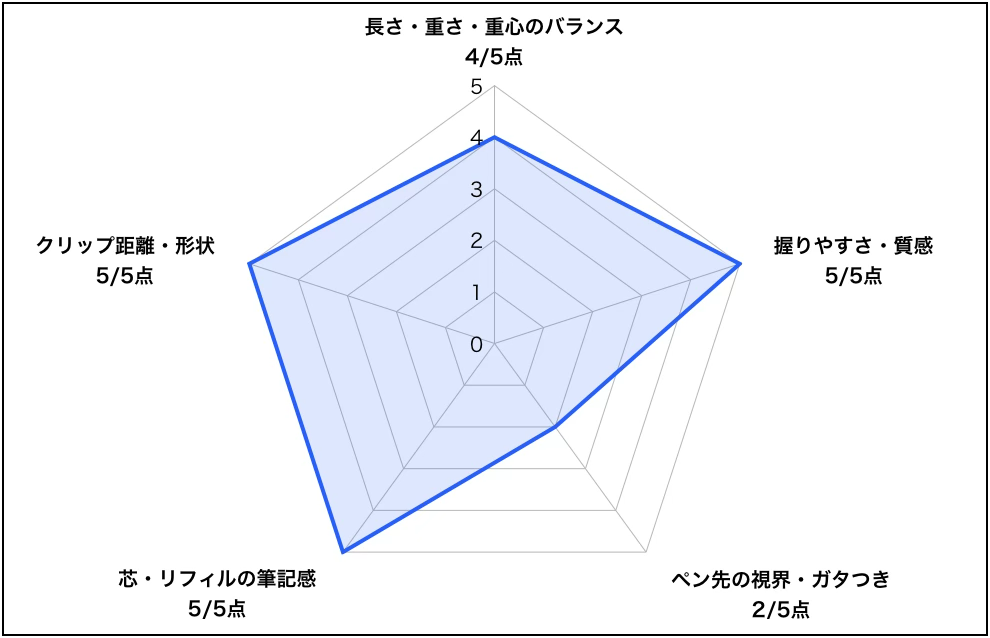 最初の数字だけ見れば平凡そうに思えますが、それでも4点級のペンです。加えて、機能面や細かい部分で使いやすいよう工夫されているため4点の中でも上位クラスに書きやすいと考えております。
