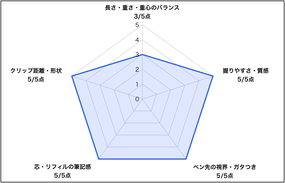数値配分が整っており、そこそこ重量のあるペンとしては書きやすい部類でしょう。