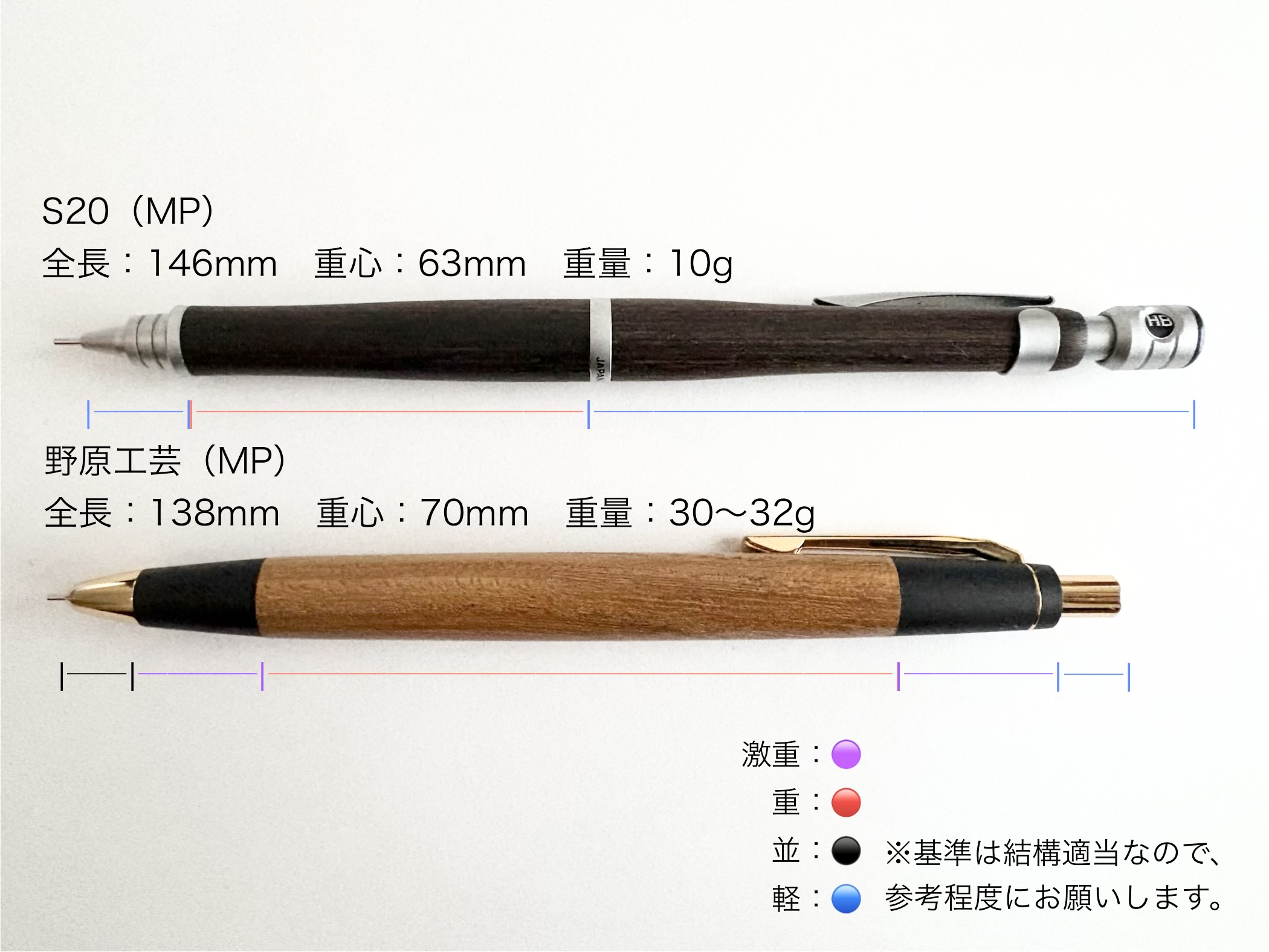 S20は全てシャープペンと比較しても最上位クラスと考えていますので、重たくて中重心の野原工芸では分が悪いでしょう。