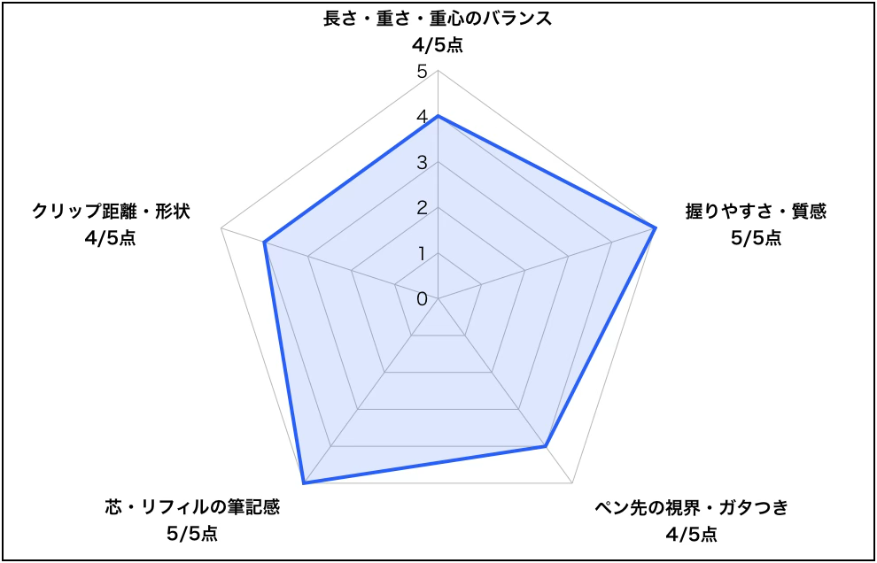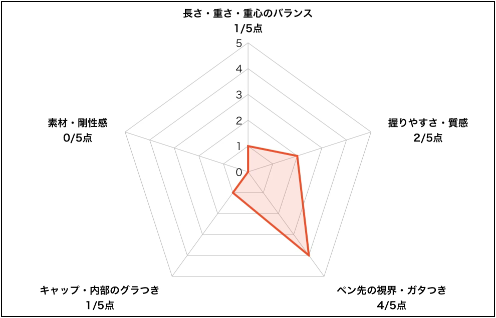 点数化するにあたり、何度か比較・使用を繰り返しました。5点にしようかかなり迷いましたが、長期筆記では、軽量・高重心の使いにくさが表れ、手への負担が気になってきました。